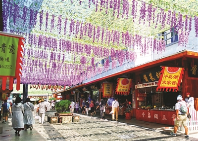 国庆、中秋佳节将至,为给市民游客营造良好的旅游和购物环境,千旅秀水街公司在街区上空的纳凉防晒棚上,悬挂色彩靓丽的紫藤花串,让街区变得丰富多彩且动感十足,游人仿佛置身于梦幻的花海中。记者 杨波 通讯员 何胤昉