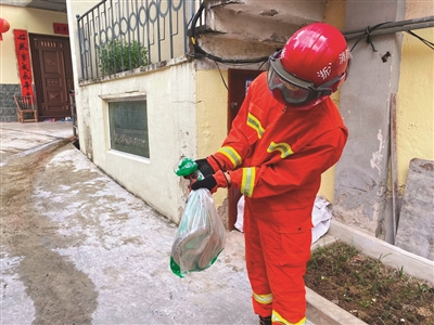 到达现场后,消防员发现小区内一条蛇蜷缩在一个纸箱里面。在做好周边人群疏散和警戒后,一名消防员悄悄用捕蛇夹靠近并迅速将蛇夹住,另一名消防员眼疾手快抓住蛇头加以控制,放入事先准备好的编织袋中,并带到郊外山上进行放生。