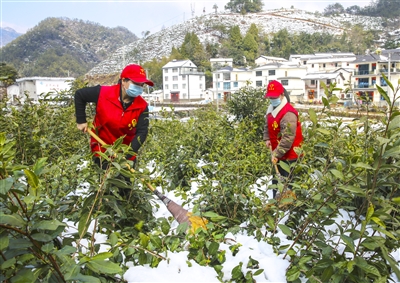 2月23日,金峰乡为应对冰冻大雪天气对农作物带来损失,组织党员志愿者服务队来到下源村和金峰村的茶园里,为茶树清除积雪,防止新茶嫩芽被冻坏,最大程度降低茶农的生产损失。