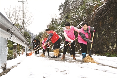 连续降雪使屏门乡金陵村地面积雪达到15公分左右。2月23日一大早,金陵村妇女党员干部就立即对村里的留守老人进行走访,了解孤寡老人家庭困难情况。村妇女干部闻木翠等3人还帮腿脚不便的孤寡老人罗秋花、詹留花等雪里摘菜。该乡中心幼儿园组织全园党员及教师对园区及园区周边路面进行清扫,保证幼儿安全入园。