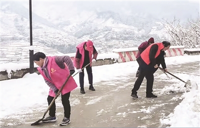 大雪造就了风景,也引发了困境。大雪过后,扫雪清道的红马甲立即活跃于城乡,组成了一幅幅红白辉映“暖心图”。