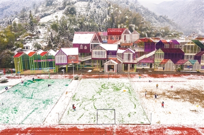 2月23日,富文乡中心小学雪景迷人,宛如童话城堡。孩子们在操场玩雪、打雪仗,享受童年的快乐。
