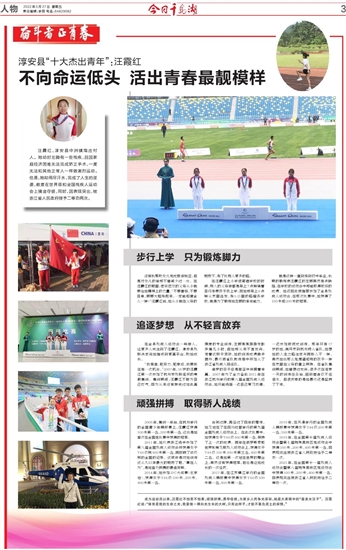 汪霞红,淳安县中洲镇南庄村人。她幼时左脚有一些残疾,且因家庭经济困难无法完成矫正手术,一度无法和其他正常人一样做激烈运动。但是,她却用尽汗水,完成了人生的逆袭,数度在世界级和全国残疾人运动会上摘金夺银,同时,因表现突出,被浙江省人民政府授予二等功两次。