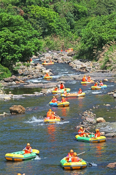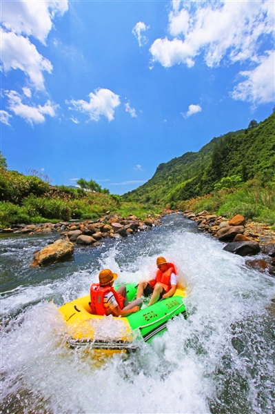九龙溪漂流河道蜿蜒曲折,河水清澈,两岸绿树婆娑,鸟鸣虫唱,生意盎然。全程约4公里,途中起伏落差适宜,时而水流平缓,时而急流险滩,置身漂流中,有回归大自然的无限情趣。