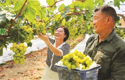 近日,千岛湖镇“双英家庭农场”科技大棚内阳光葡萄挂满枝头,长势喜人。农场主夫妻正在采摘首批成熟的果实,准备销往北京、上海、杭州等地。据了解,今年千岛湖镇“双英家庭农场”的阳光玫瑰葡萄亩产达到4000多斤,亩产值达10万元以上。记者 王建才