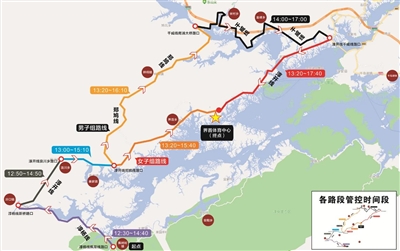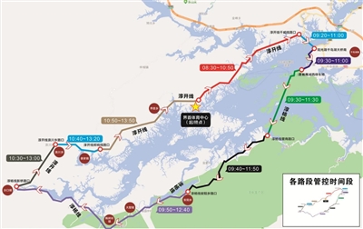 其中淳开线将在8时30分至13时50分实行分时分段管控,千岛湖主城区赛道将在9时30分至11时实行管控,淳杨线将在9时30分至12时40分实行分时分段管控,具体路段管控时间见下图: