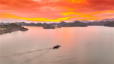 冬日清晨,在界首乡严家村,金色的霞光从天边铺泻而来,绚丽的朝霞映在平静湖面上,构成一幅水天一色的壮丽景观。渔民们迎着朝霞,驾驶渔船回港,湖面泛起了层层波浪,与岛屿自然风光相互辉映,美轮美奂。