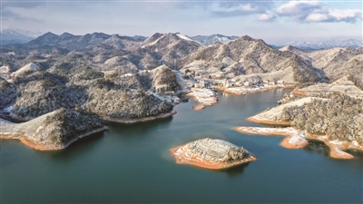 1月23日,在里商乡水域,从空中俯瞰,千岛湖曲曲折折、星星点点的岛屿被白雪覆盖,浮在碧波之上,构成了一幅别样的冬日图景。