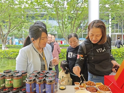 在“淳六味”摊位前,工作人员正向顾客详细介绍黄精的功效,并邀请大家免费品尝黄精茶、黄精芝麻丸等特色产品;千岛农家酱摊位上,虾皮酱、鱼干酱、火腿酱等各色农家酱鲜香味美,让市民们连连称赞;千岛湖茶摊位旁,四溢的茶香扑鼻而来,茶客们闻鲜而至、络绎不绝……在人群中还不时能看到几名“红马甲”在摊位间穿梭,在杭流动党员们又一次化身“带货达人”,为“千岛集市”聚人气、添活力,积极推介家乡的农特产品,助力家乡百姓增收致富。“这次活动我们带来了黄金茶、葡萄酒、豆腐干等一些中洲特色产品。”中洲镇在杭流动党支部委员姜培边热情地向市民们介绍边笑着说,“作为在杭流动党员,虽然远离家乡,也想为家乡出一份力。”